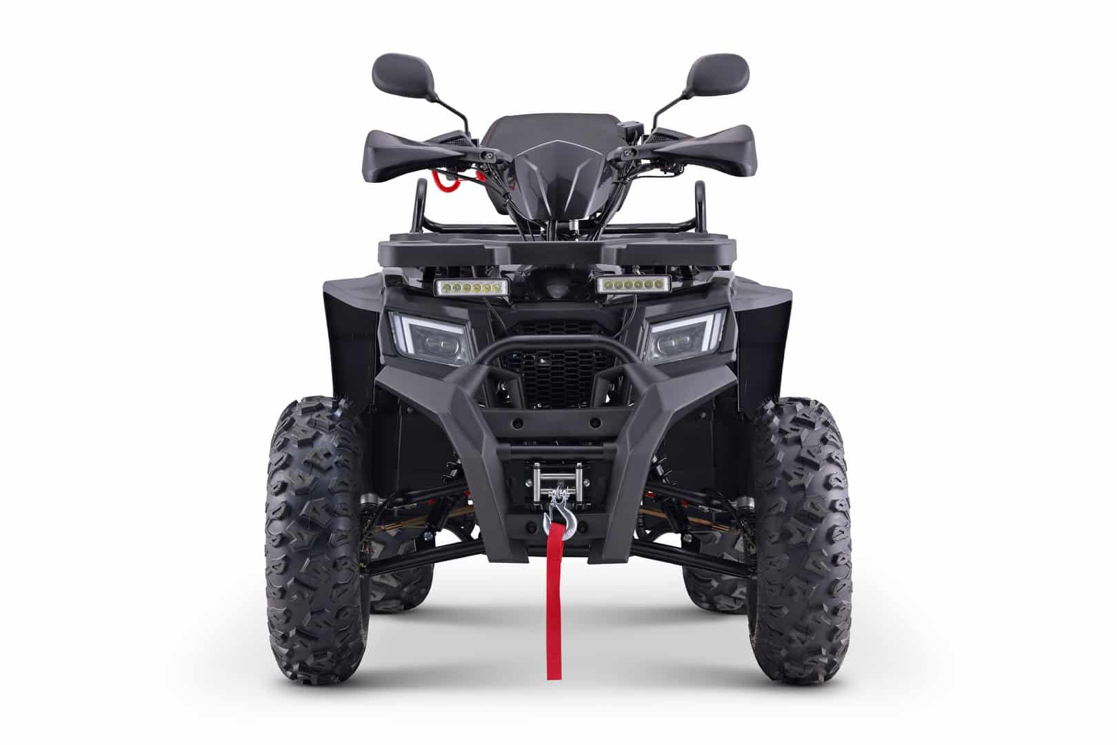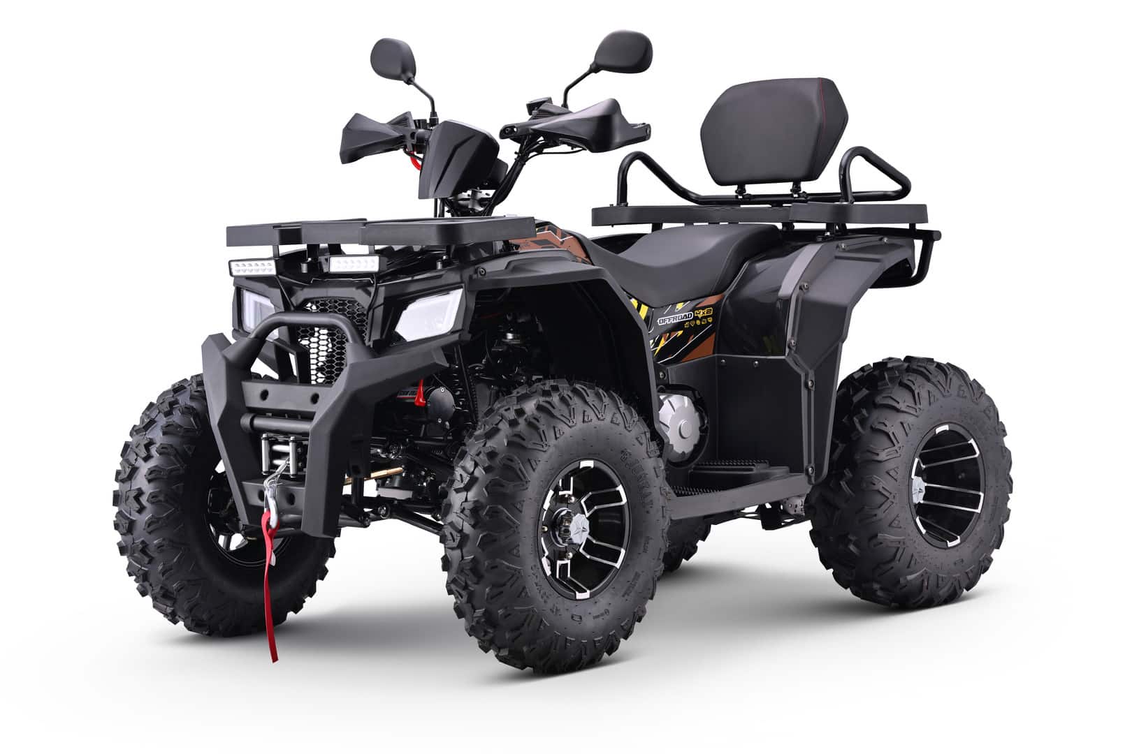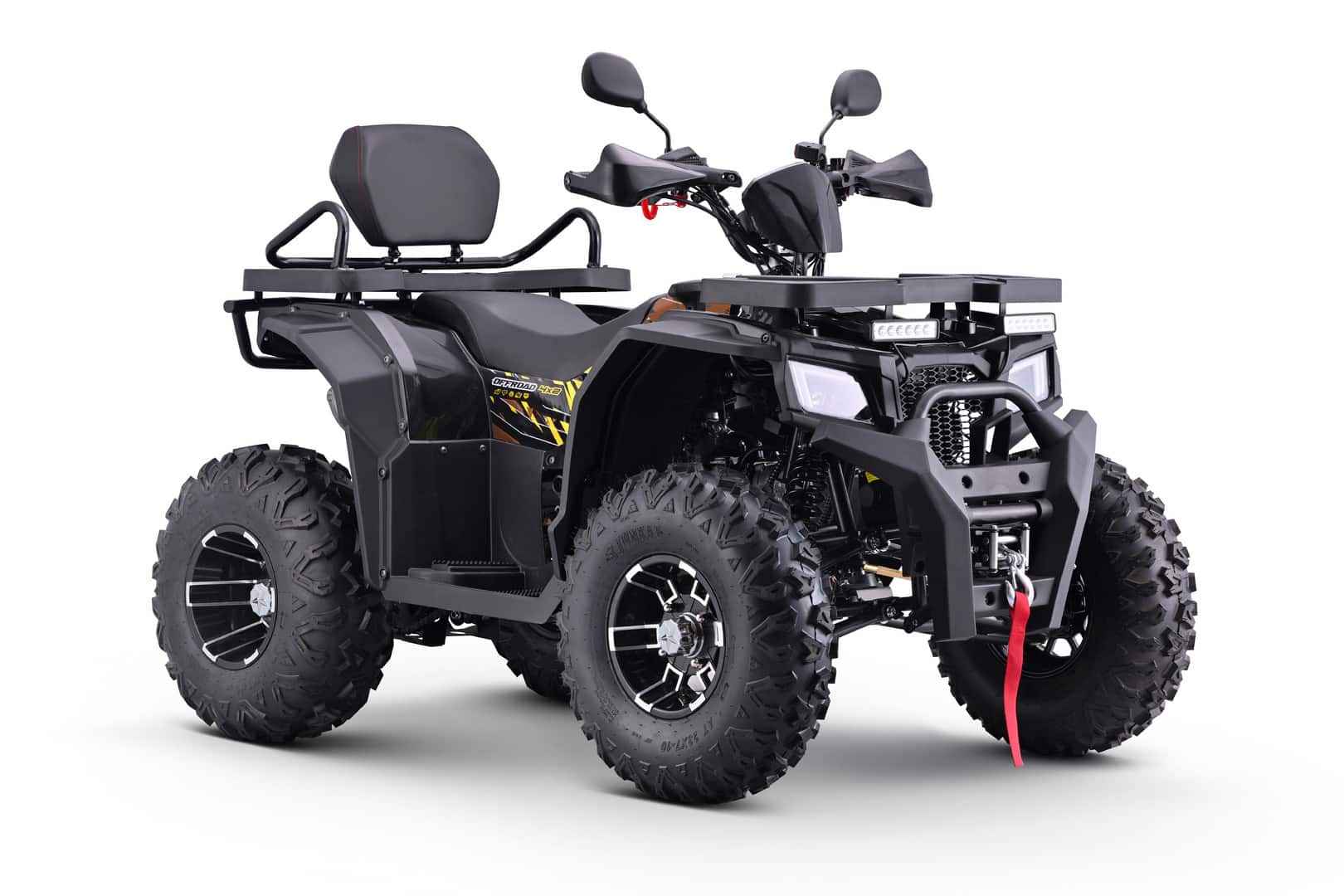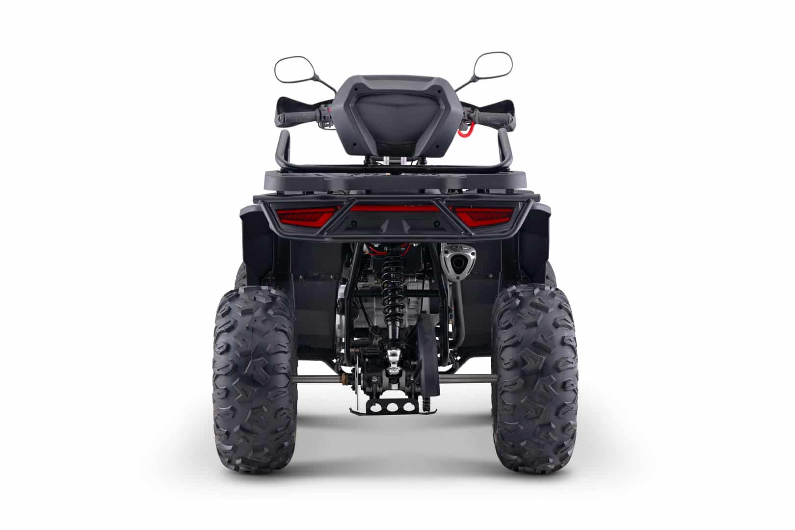 Квадроцикл отличается повышенной проходимостью: литые диски, агрессивные шины и дорожный просвет позволяют уверенно преодолевать грязь, снег и неровности. Дисковые тормоза на всех колесах обеспечивают безопасность, а лебедка и кенгурятник расширяют возможности эксплуатации в экстремальных ситуациях. При колесной базе 1200 мм и весе 172 кг он сохраняет устойчивость и маневренность.