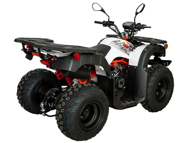 Автоматическая вариаторная трансмиссия с реверсом упрощает управление и маневрирование в узких местах, а надёжный цепной привод на задние колёса обеспечивает долговечность. Рама квадроцикла выполнена из прочного хром-молибденового сплава, что придаёт конструкции лёгкость и устойчивость к повреждениям.