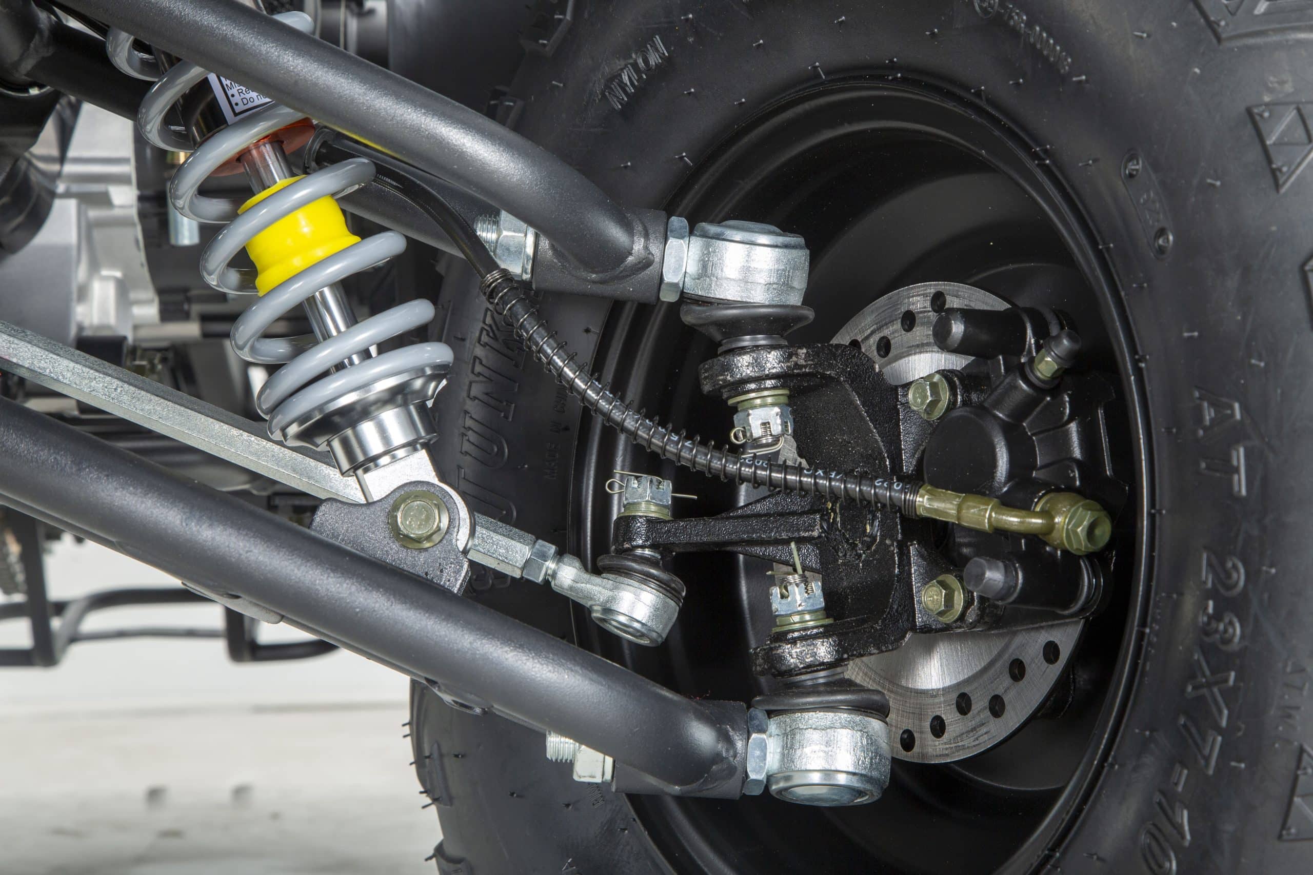 Удобное расположение рычага переключения передач, газомасляные амортизаторы и 2-х рычажная передняя подвеска обеспечивают плавность хода и устойчивость на пересеченной местности. Надежные дисковые тормоза на передних и задних колесах гарантируют безопасность при резком торможении. Шины размером 23х7-R10 спереди и 22х10-R10 сзади, а также цепь привода типа 530 обеспечивают отличное сцепление с дорогой и высокую проходимость.
