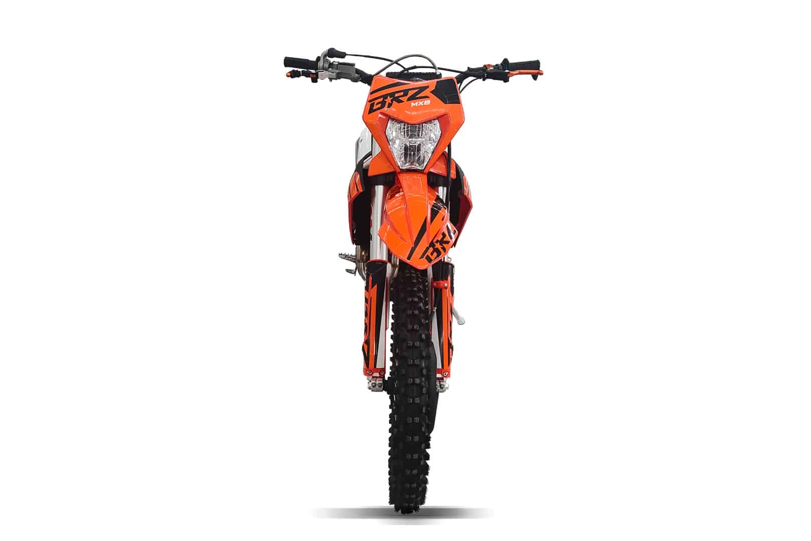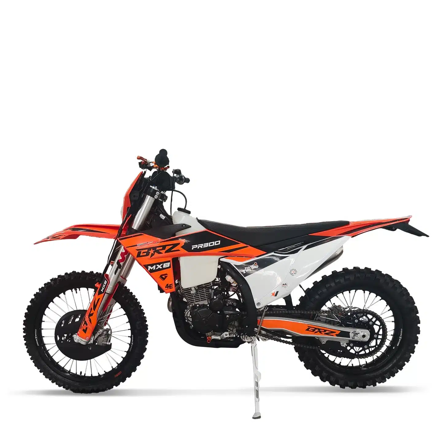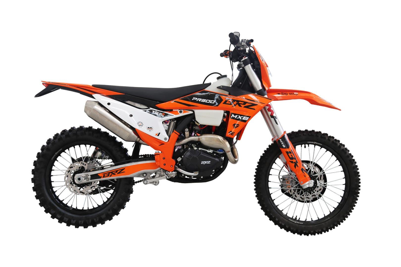 BRZ MX8 PR300 24 — это полноразмерный эндуро с воздушным охлаждением, построенный на новейшей раме К10, выполненной по подобию рамы KTM 2024 года. Сердцем мотоцикла является надежный двигатель Zongshen ZS172FMM-5 объемом 300 см³ с балансировочным валом, который работает в паре с карбюратором Nibbi PWK32 Black, обеспечивая стабильную работу и уверенную тягу. Ключевой особенностью модели стала полностью обновленная геометрия рамы с улучшенной развесовкой и более низким расположением мотора, что позволило снизить центр тяжести и значительно улучшить управляемость мотоцикла.