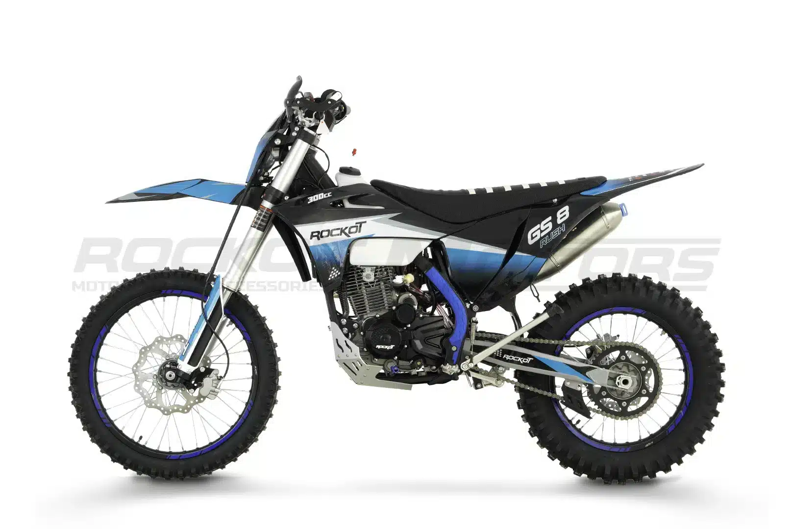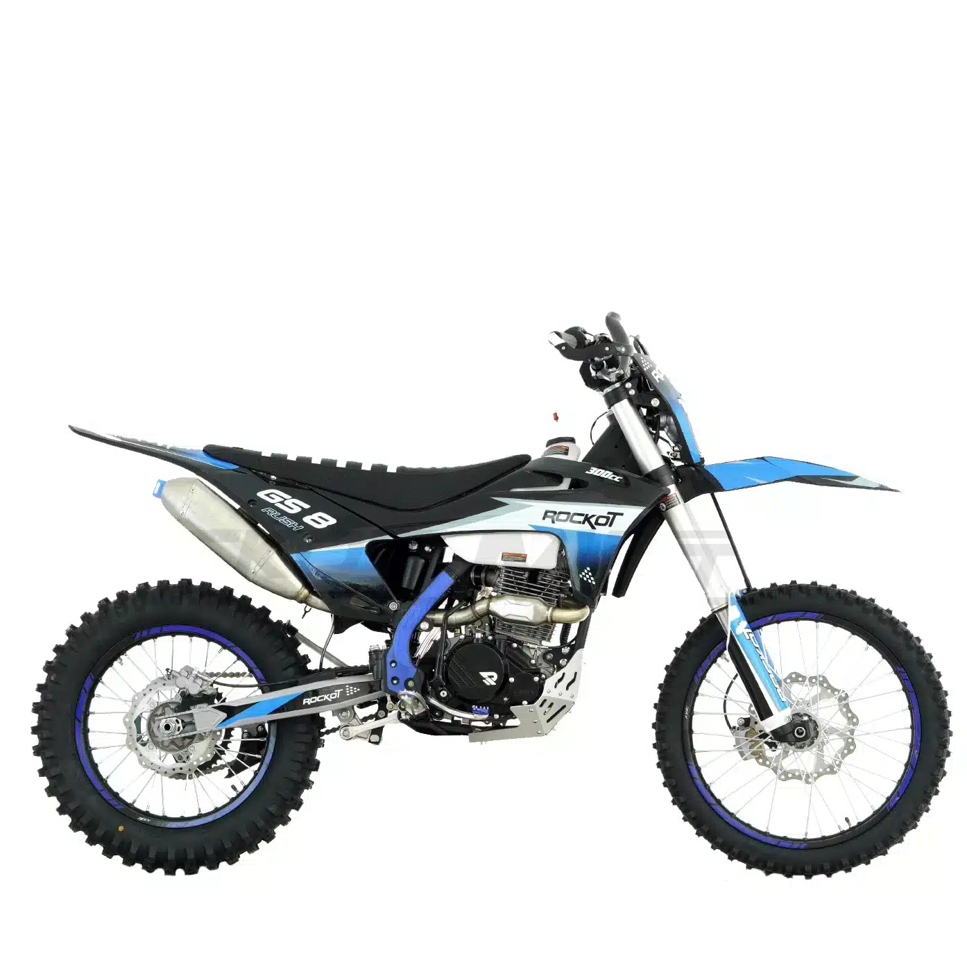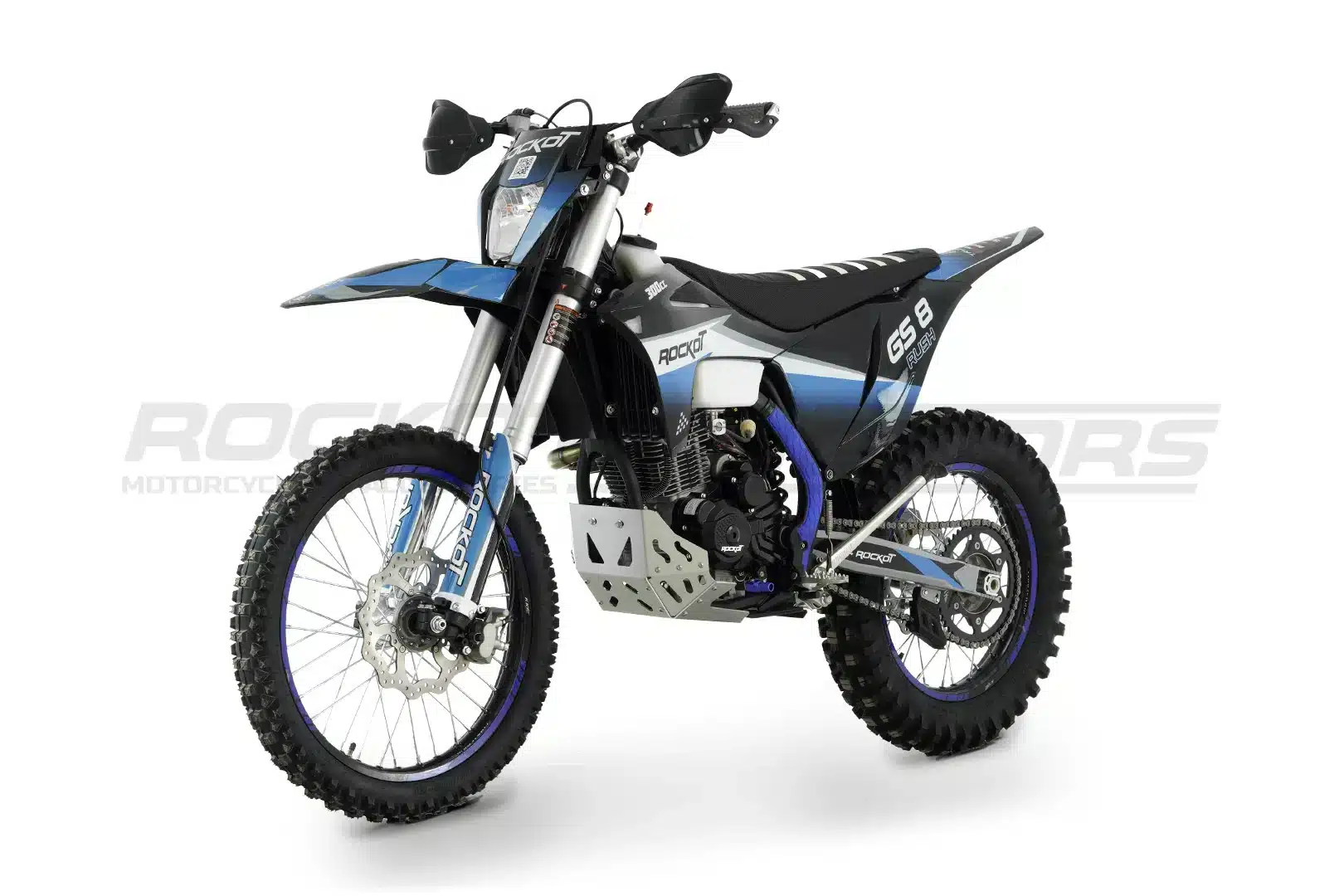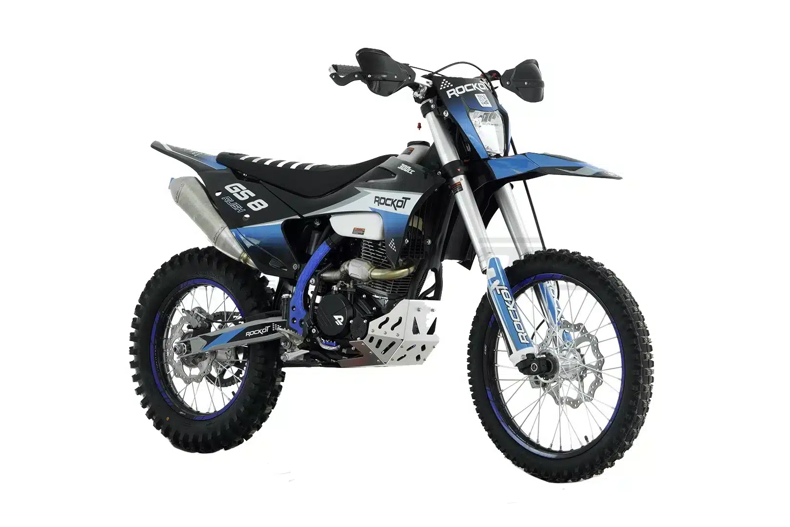 ROCKOT GS 8 Rush 2.0 – это топовый полноразмерный эндуро-мотоцикл для профессионального использования. Агрессивный дизайн в черно-синей гамме с пластиком в стиле GASGAS подчеркивает его спортивный характер. Мотоцикл построен на усиленной хром-молибденовой раме с шестигранным сечением труб, обеспечивающей идеальную жесткость и управляемость на сложных трассах. LED-оптика и фирменная графика завершают брутальный образ этого внедорожного снаряда.