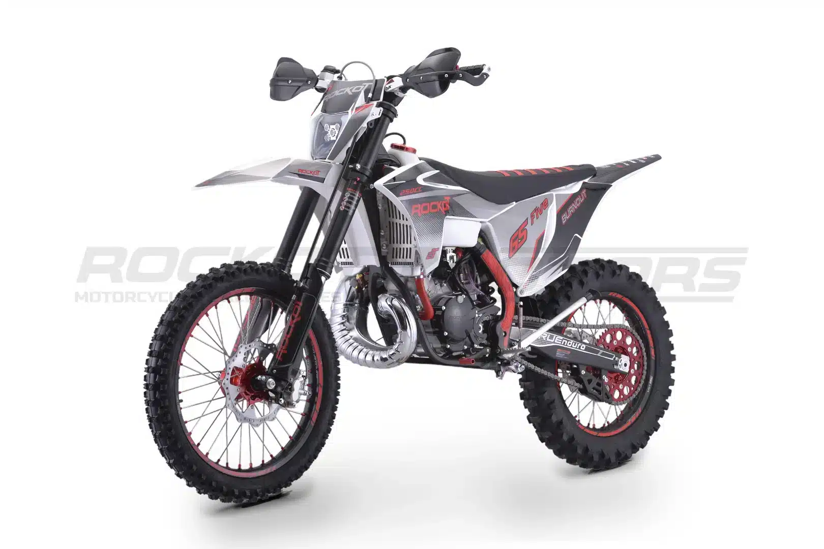 ROCKOT GS FIVE Burnout – это профессиональный двухтактный эндуро-мотоцикл, созданный для победы в самых экстремальных условиях. Агрессивный дизайн в серо-красной гамме с пластиком в стиле GASGAS и пятилинзовой LED-фарой подчеркивает его спортивный характер. Особое внимание привлекает хром-молибденовая рама S8 с шестигранным сечением труб, обеспечивающая идеальную управляемость при массе всего 124 кг.