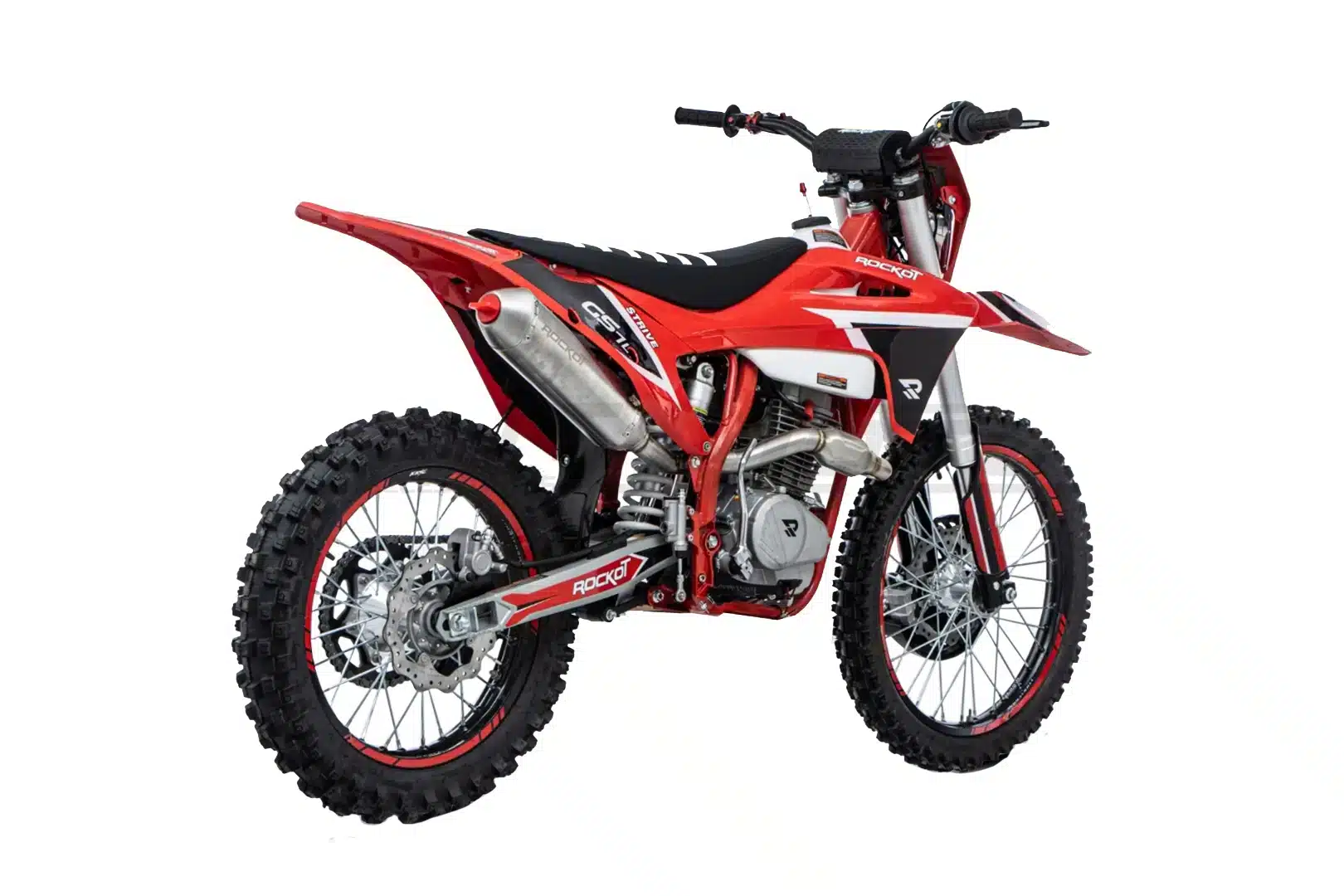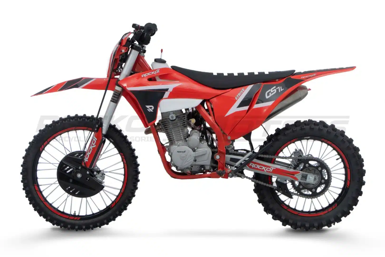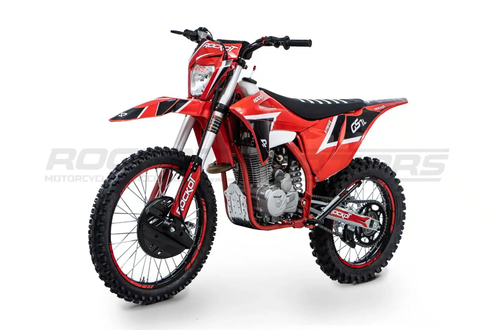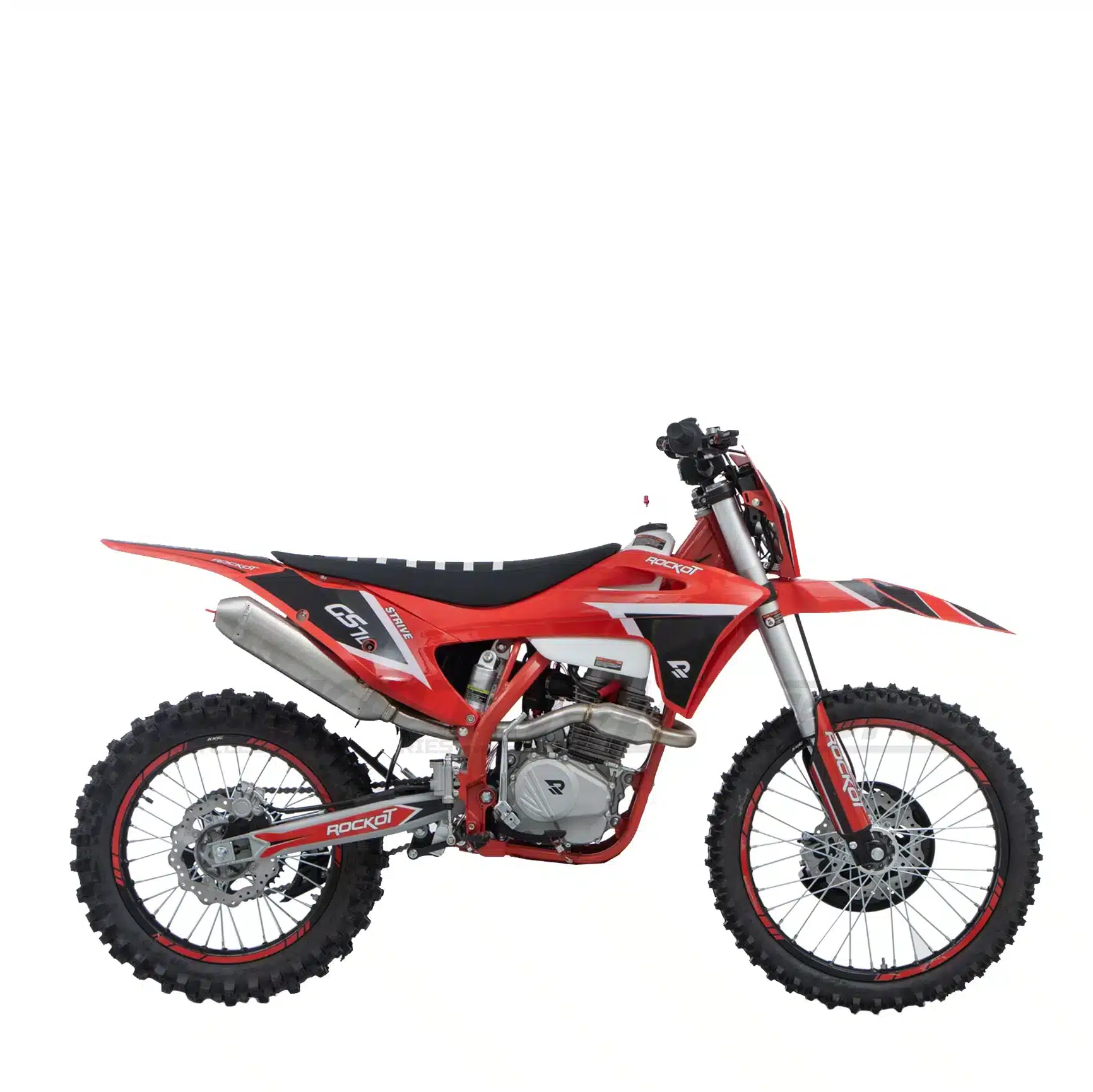 ROCKOT GS7-L Strive – это новый среднеразмерный эндуро-мотоцикл, созданный для поклонников агрессивного внедорожного стиля. Яркий дизайн в красно-черной гамме с пластиком в стиле GASGAS и контрастными серебристыми элементами подвески придает байку спортивный и современный вид. Особое внимание привлекает прочная хром-молибденовая рама S6 с шестигранным сечением труб – такая же, как на полноразмерных моделях ROCKOT, что гарантирует исключительную прочность при сохранении малого веса.
