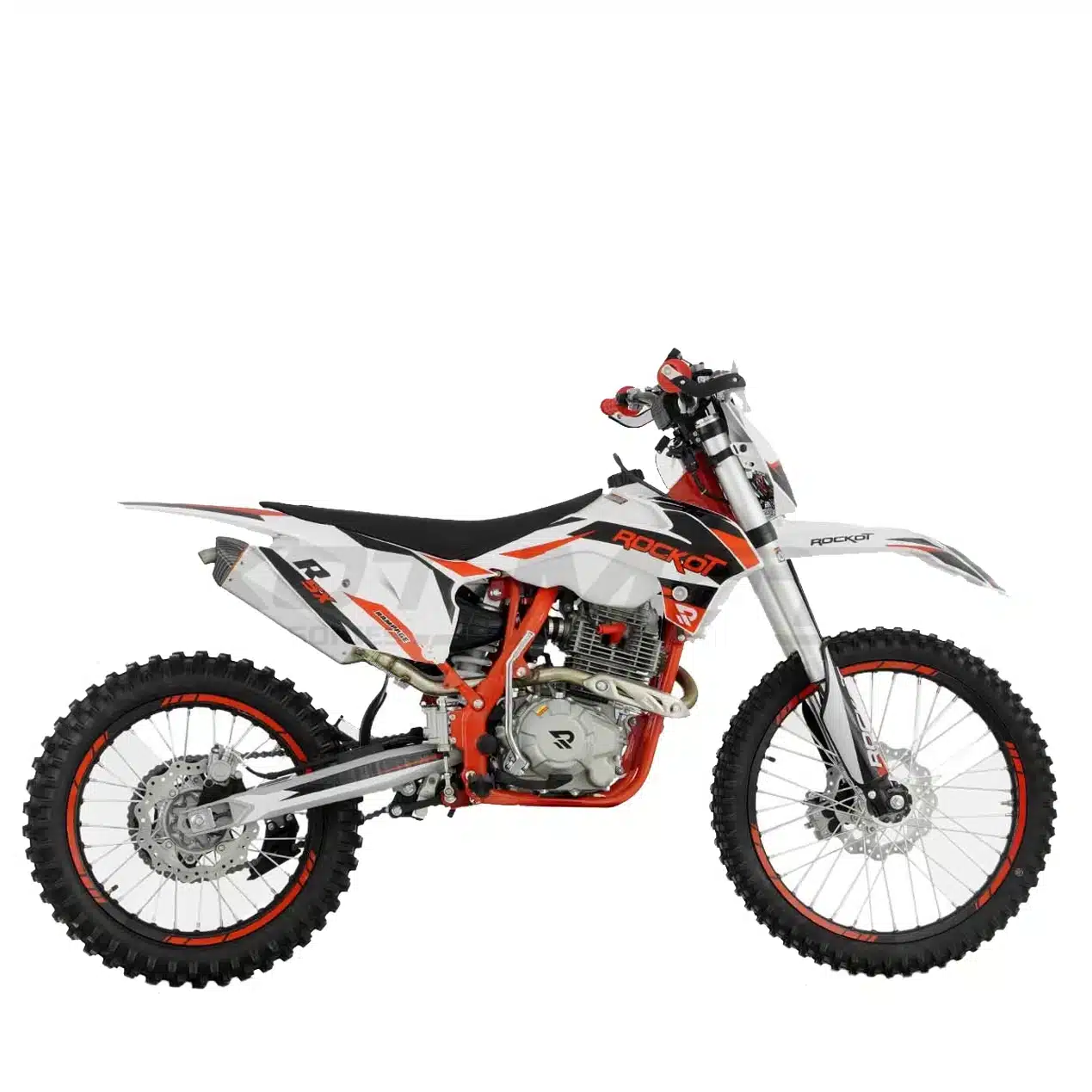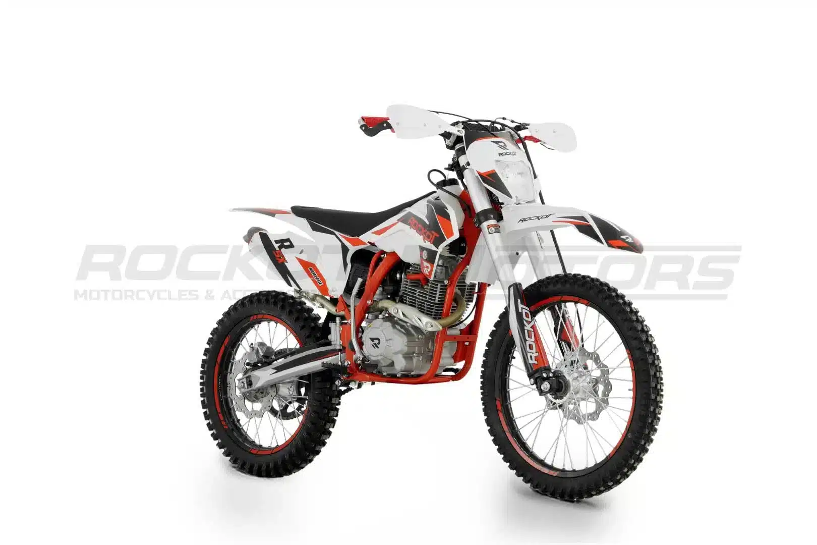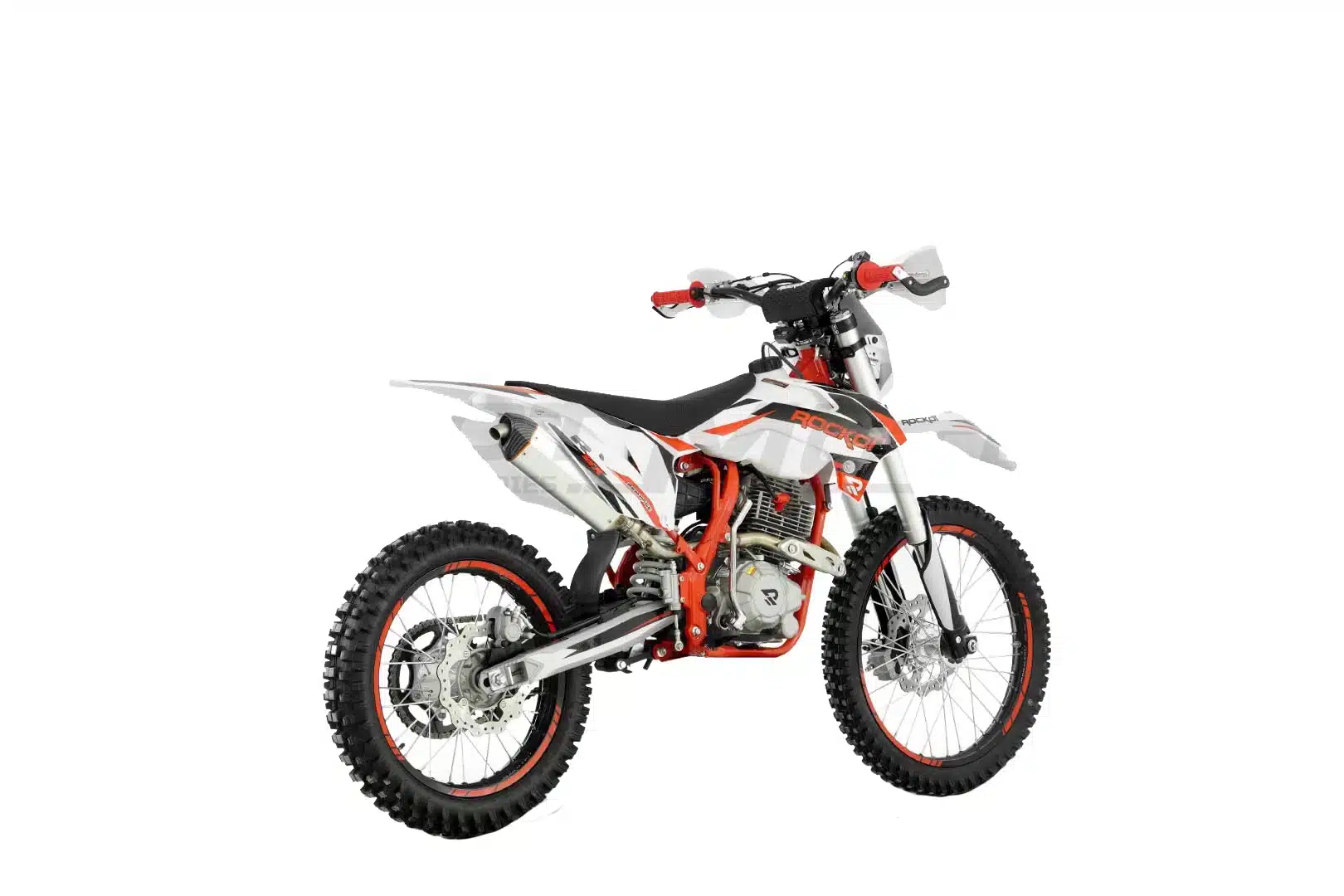 ROCKOT R5X Rampage – это среднеразмерный эндуро-мотоцикл, сочетающий в себе спортивный характер и практичность. Созданный на базе популярных моделей R5F Raptor и R5 Cyclone, он сохранил лучшие черты линейки R Series. Агрессивный дизайн в особенном стиле с сочетанием белого, красного и черного цветов подчеркивает его динамичный характер. Красная рама, черные колесные диски с защитными наклейками и серебристые элементы придают мотоциклу стильный и современный вид.