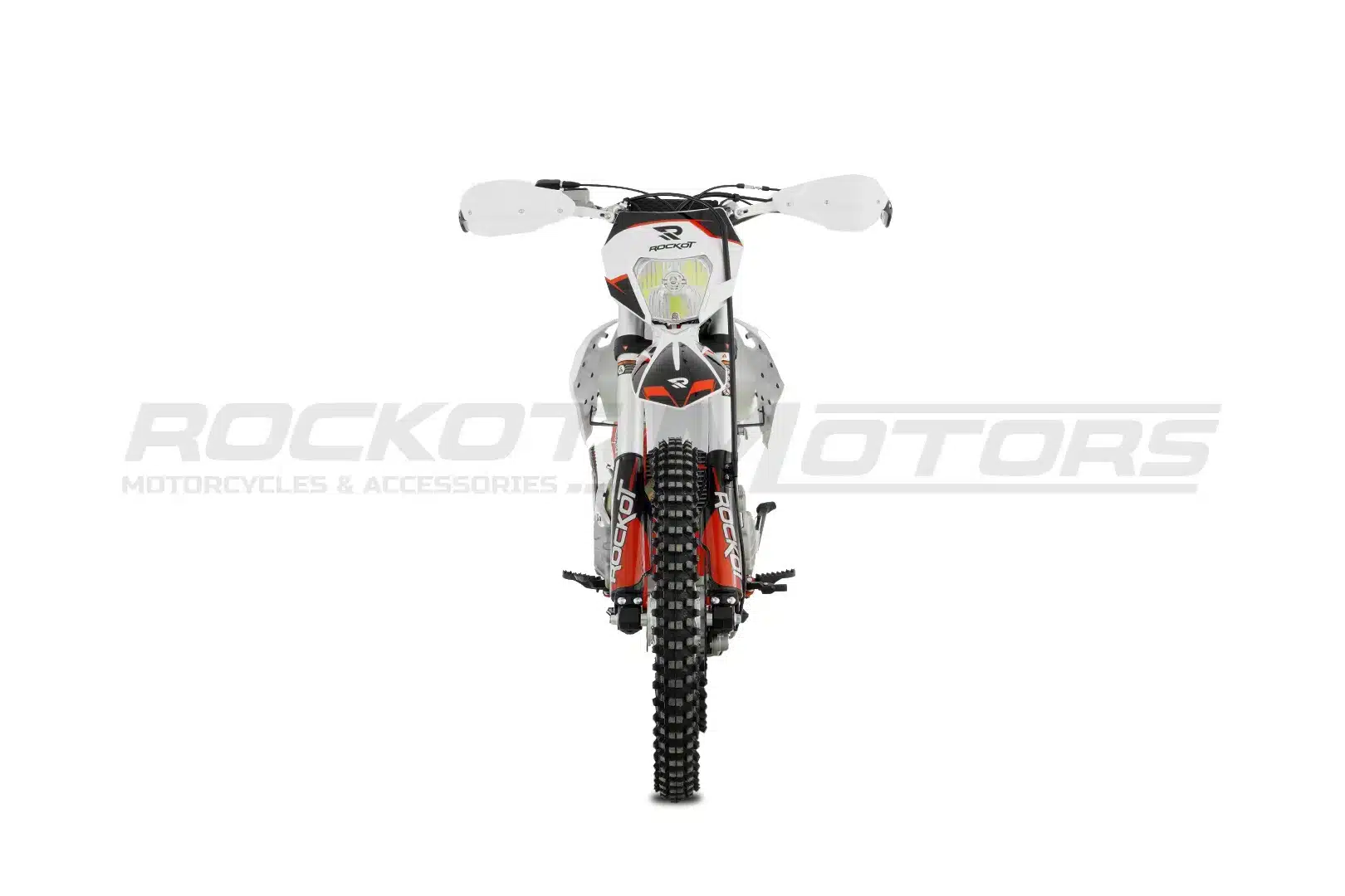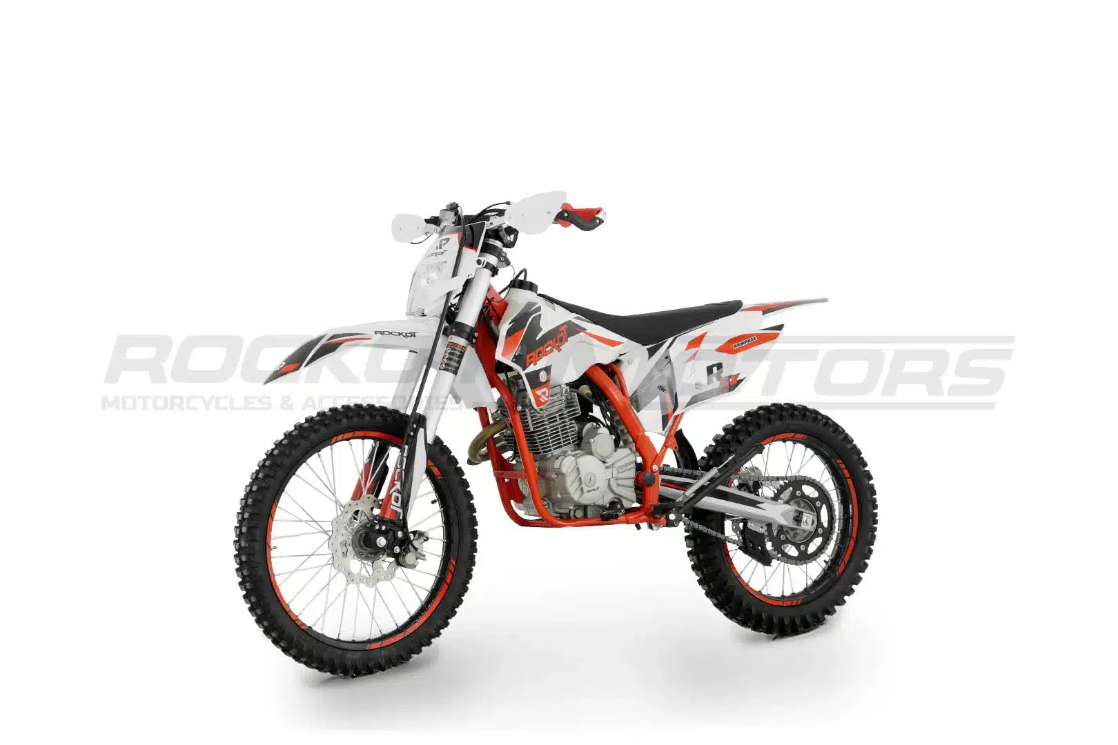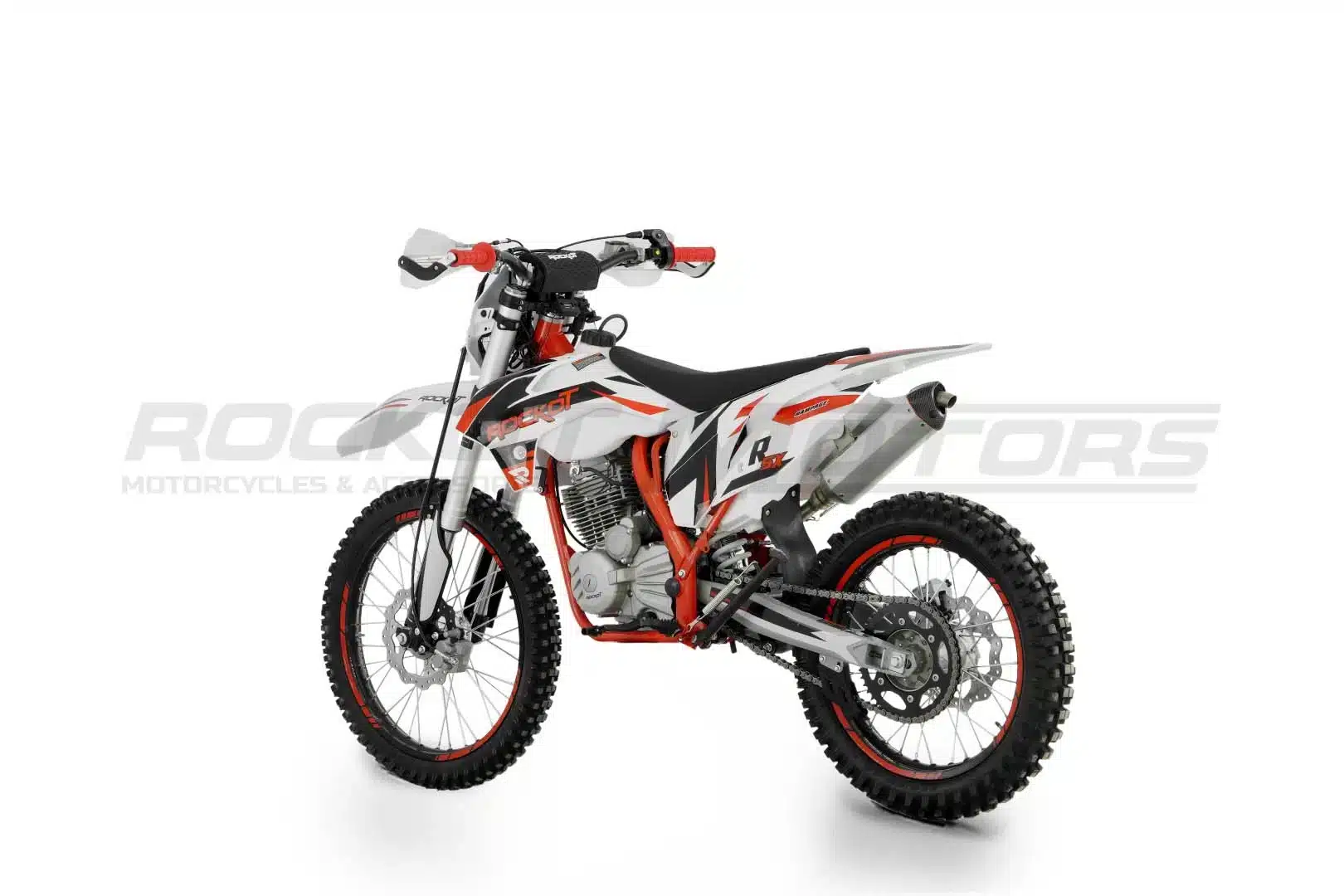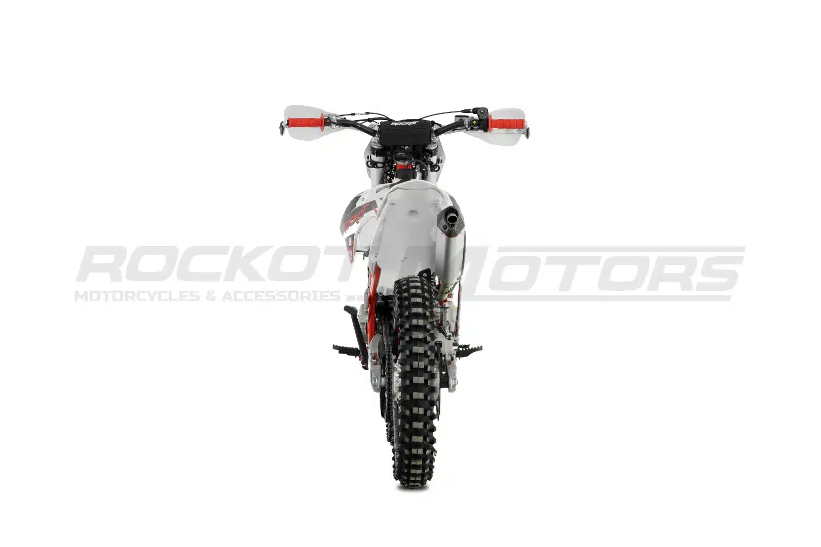 ROCKOT R5X Rampage – это среднеразмерный эндуро-мотоцикл, сочетающий в себе спортивный характер и практичность. Созданный на базе популярных моделей R5F Raptor и R5 Cyclone, он сохранил лучшие черты линейки R Series. Агрессивный дизайн в особенном стиле с сочетанием белого, красного и черного цветов подчеркивает его динамичный характер. Красная рама, черные колесные диски с защитными наклейками и серебристые элементы придают мотоциклу стильный и современный вид.
