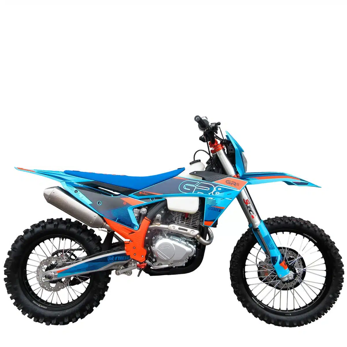 GR8 F300A Enduro Optimum – сбалансированный эндуро-мотоцикл для профессионального использования, сочетающий мощность и надежность. Оснащен 4-тактным 4-клапанным двигателем CB300RL объемом 271 см³ (27 л.с.) с воздушным охлаждением и карбюратором NIBBI PWK32, обеспечивающим стабильную работу в любых условиях. 5-ступенчатая КПП и 8-литровый бак оптимальны для продолжительных внедорожных заездов, а продуманная система охлаждения гарантирует стабильность работы даже при экстремальных нагрузках.