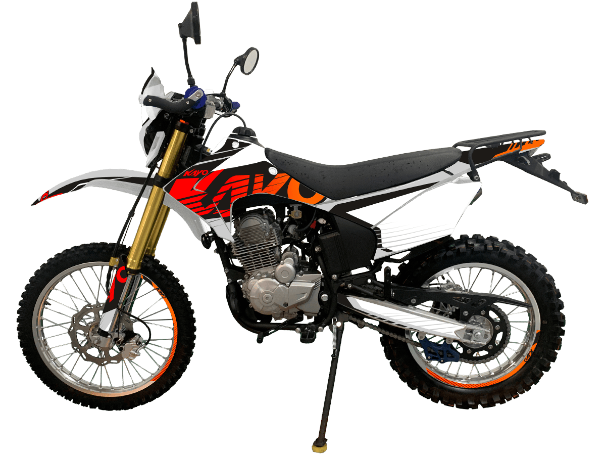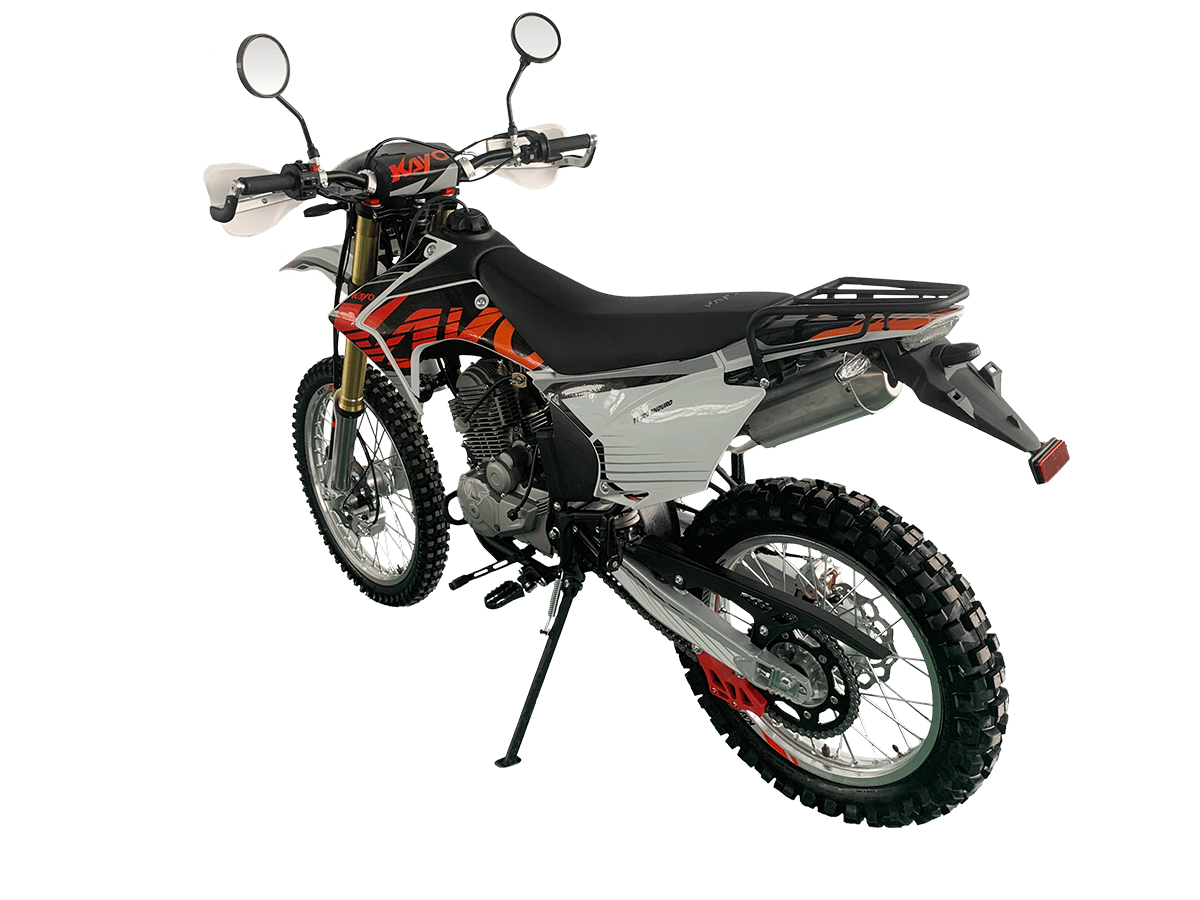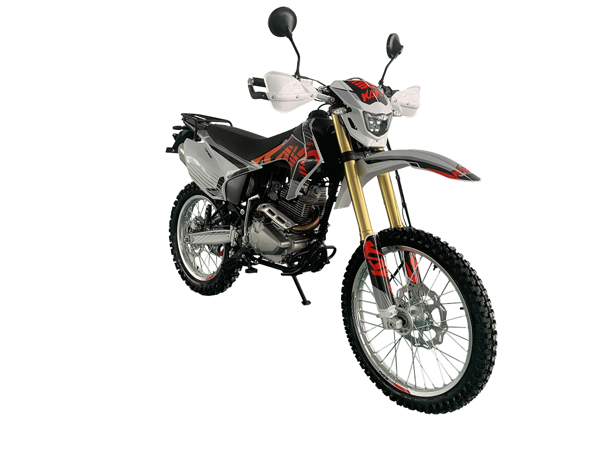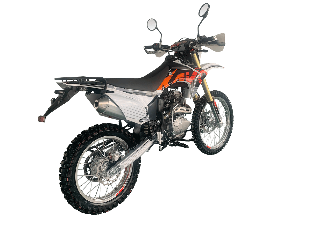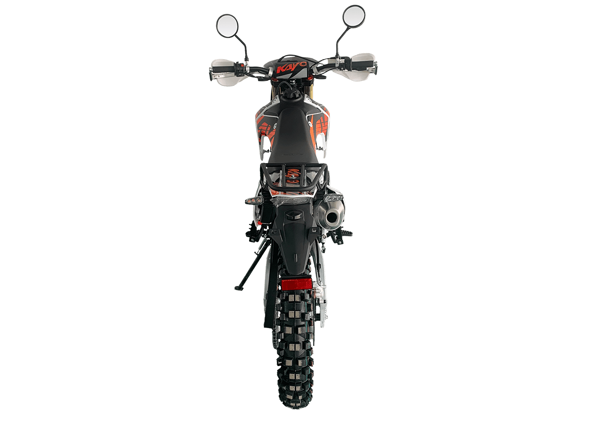 KAYO T1 300 Enduro полностью подготовлен для дорог общего пользования – имеет ПТС, яркую светотехнику (LED-фару, поворотники, стоп-сигнал), цифровую приборную панель и зеркала. Дополнительные преимущества включают алюминиевую защиту рычагов, грузовую платформу и пассажирские подножки. Этот мотоцикл – идеальный выбор для тех, кто ищет универсальную технику для ежедневных поездок и экстремальных внедорожных приключений.