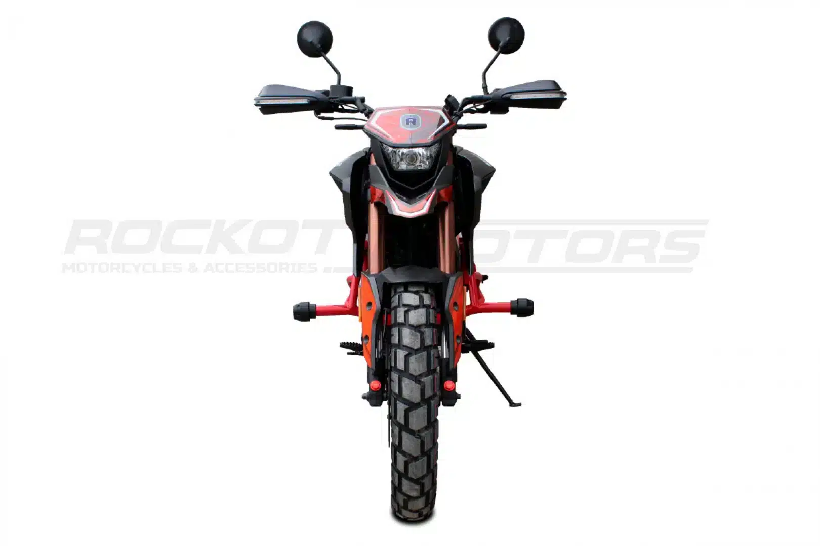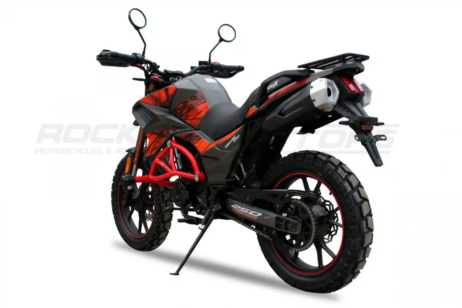 Представляем вашему вниманию ROCKOT HOUND 250 LUX – современный турэндуро, который одинаково уверенно чувствует себя как на городских улицах, так и на загородных трассах. Яркий оранжевый окрас и агрессивный дизайн сразу выделяют эту модель из толпы. В основе мотоцикла лежит проверенный временем 223-кубовый 4-тактный двигатель Loncin с балансирным валом, выдающий 17 лошадиных сил. Шестиступенчатая коробка передач и карбюратор PZ 30 обеспечивают плавную и предсказуемую работу силового агрегата. Усиленная стальная рама и перевернутая передняя вилка с ходом 800 мм гарантируют отличную управляемость даже на сложных участках дороги.