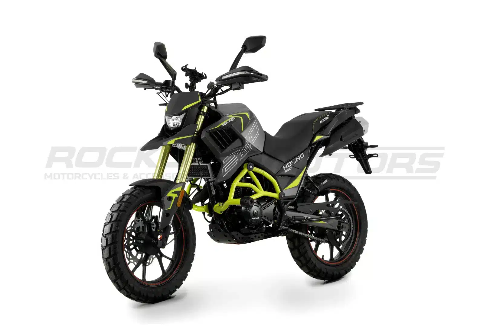 Обновлённый в 2024 году ROCKOT HOUND 250 представляет собой идеальное сочетание мощности, стиля и функциональности. Этот турэндуро оснащён современным 4-клапанным двигателем Loncin FE250 с воздушно-масляным охлаждением, выдающим впечатляющие 25 лошадиных сил. Шестиступенчатая коробка передач и карбюратор PZ32 обеспечивают плавную работу и отличную динамику. Агрессивный дизайн с LED-оптикой и новыми расцветками (серо-зеленый и бело-оранжевый) делает этот мотоцикл заметным на любой дороге.