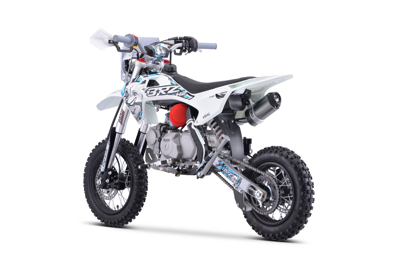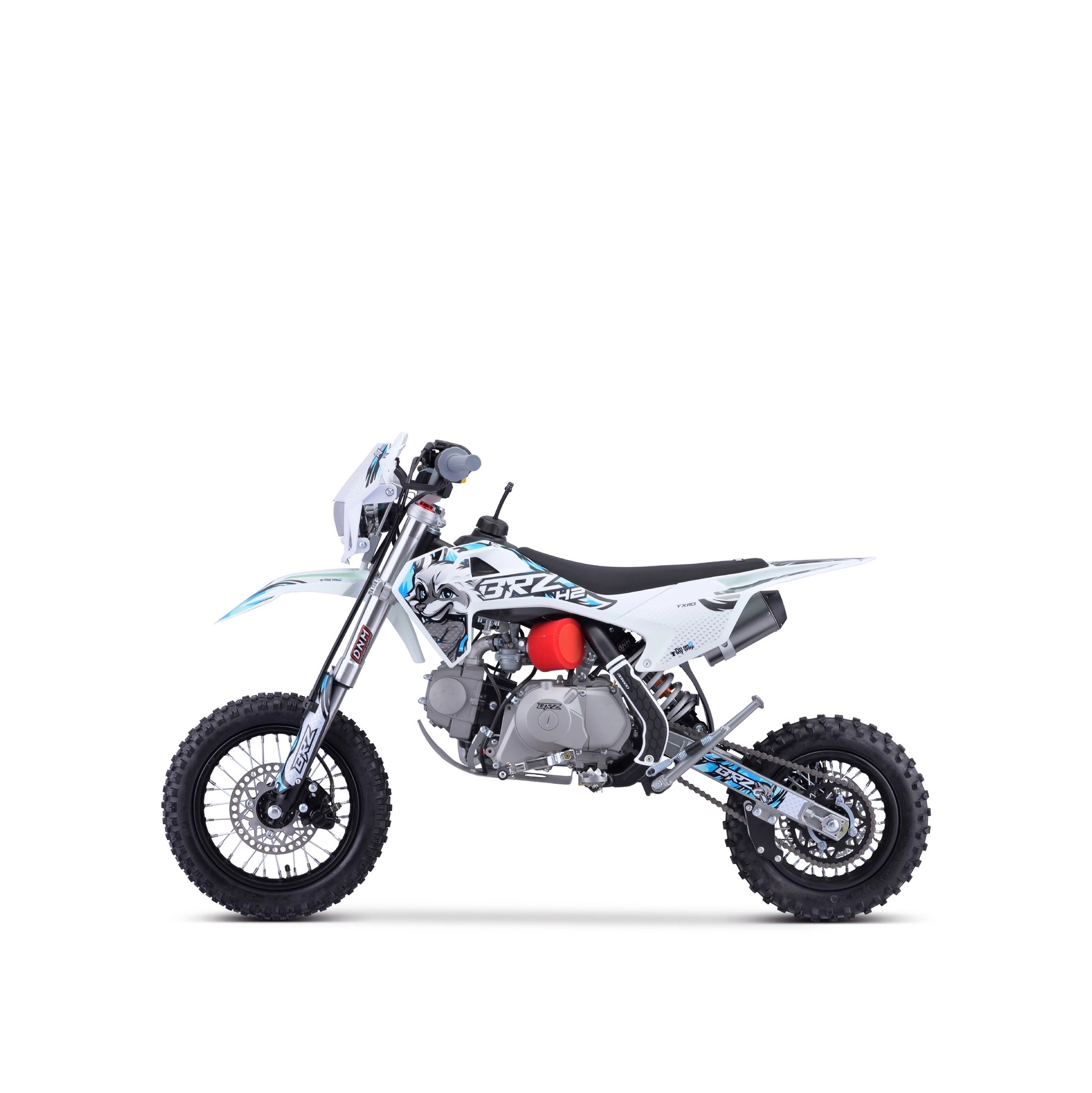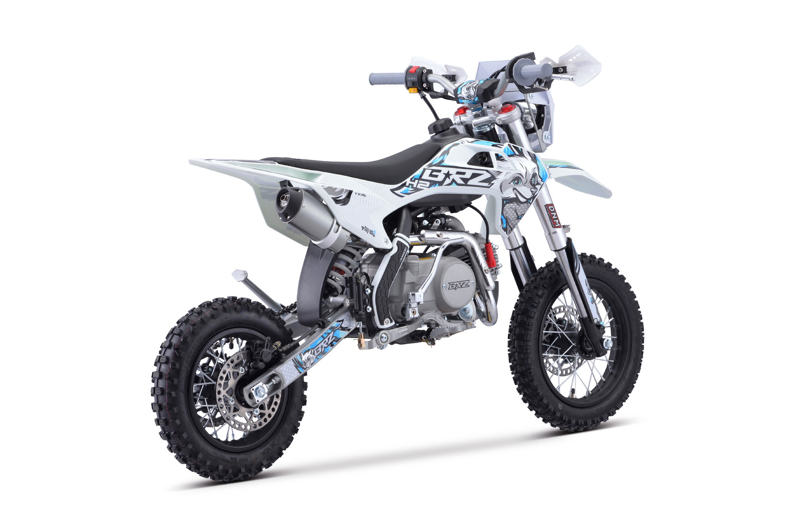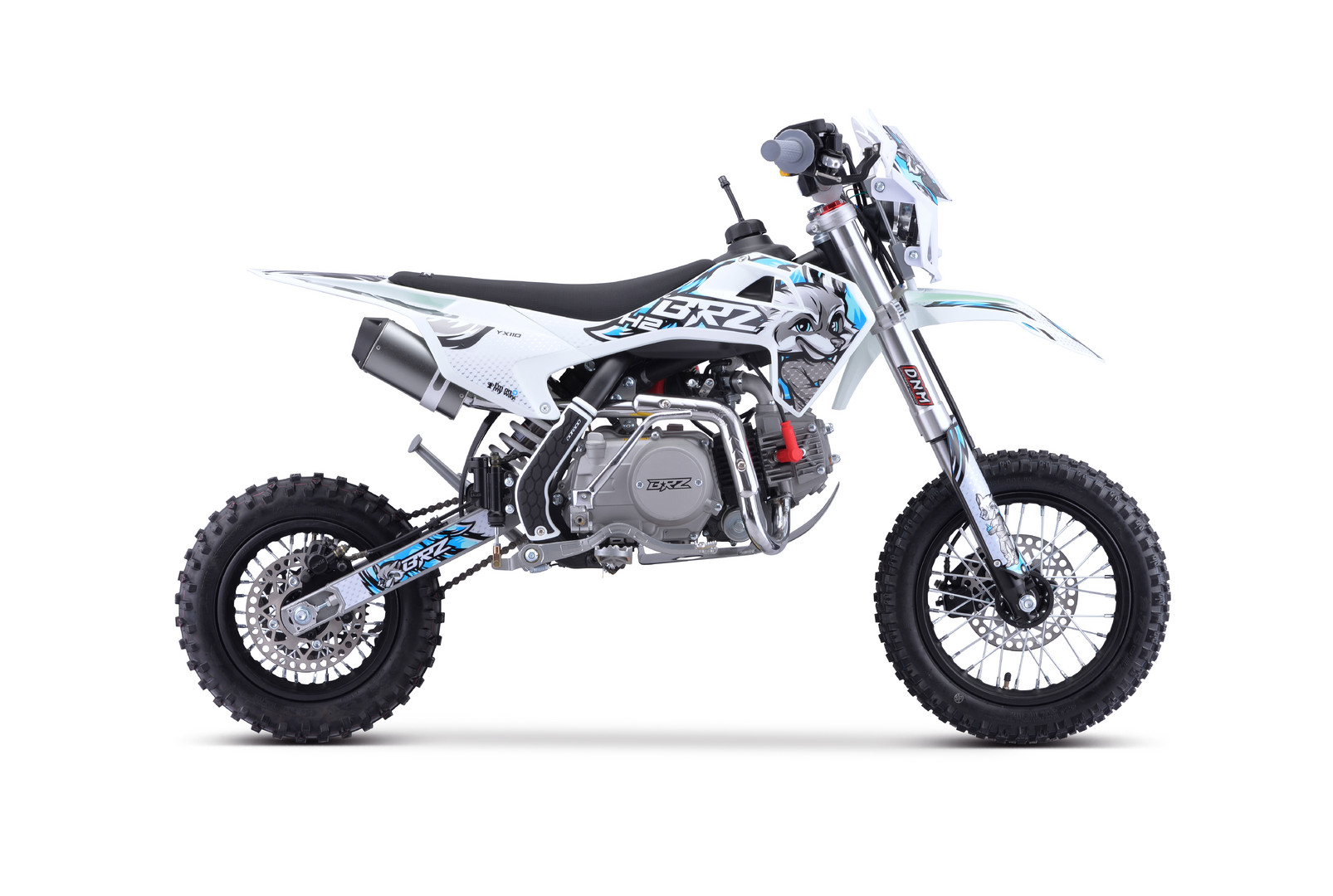 BRZ H2 YX110 12/10 — это идеальный первый питбайк для детей и подростков в возрасте от 8 до 12 лет. Модель оснащена надежным четырехтактным двигателем YX110 объемом 110 см³ с воздушным охлаждением, который выдает 8 л.с. и обеспечивает плавную, контролируемую мощность, полностью безопасную для начинающих райдеров. Полуавтоматическая коробка передач исключает необходимость работы со сцеплением, что значительно упрощает процесс обучения и делает катание комфортным для тех, кто впервые садится за руль мотоцикла. Комбинированный запуск (электростартер и кик-стартер) гарантирует легкий старт в любых условиях.