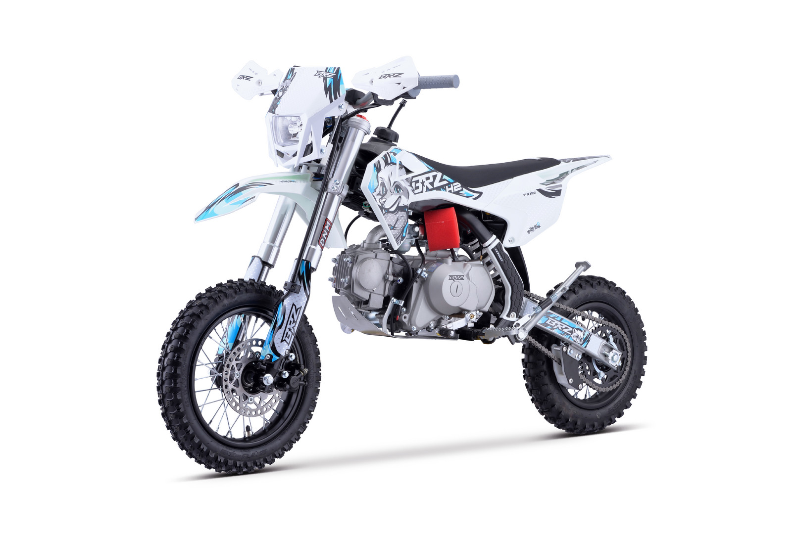 BRZ H2 YX110 12/10 оснащен всеми необходимыми элементами для безопасного и комфортного катания: фарой для вечерних заездов, электростартером для легкого запуска и топливным фильтром для защиты двигателя. Стильный дизайн и яркая окраска делают этот питбайк привлекательным для детей. Это надежный и современный выбор для родителей, которые ищут первый мотоцикл для своего ребенка, сочетающий в себе безопасность, простоту управления и качество исполнения.