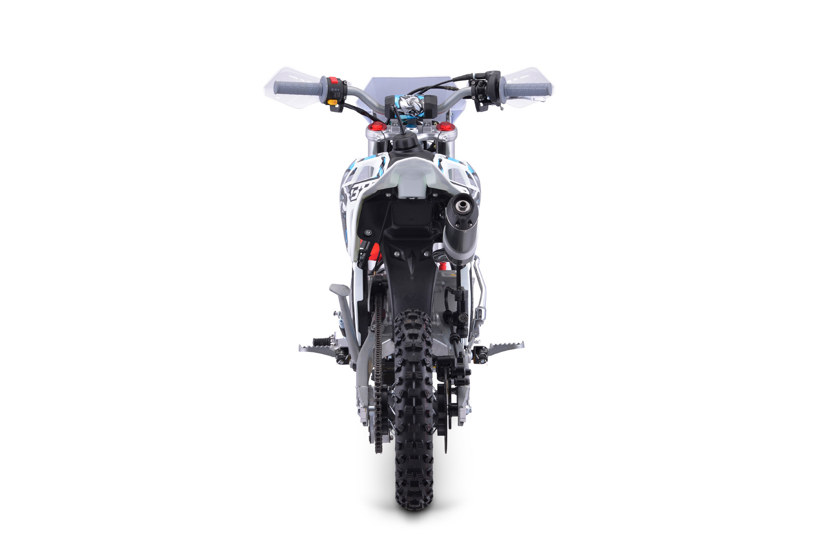 Благодаря компактной колесной формуле 12/10 дюймов и низкой высоте по седлу (680 мм) питбайк обеспечивает максимальную устойчивость и уверенность для детей ростом до 140 см. Пространственная стальная рама гарантирует прочность и долговечность конструкции, а подвеска (нерегулируемая перевернутая вилка спереди и моноамортизатор сзади) эффективно справляется с неровностями трасс. Небольшая колесная база (1090 мм) и легкий вес делают модель маневренной и простой в управлении, что особенно важно для юных райдеров.