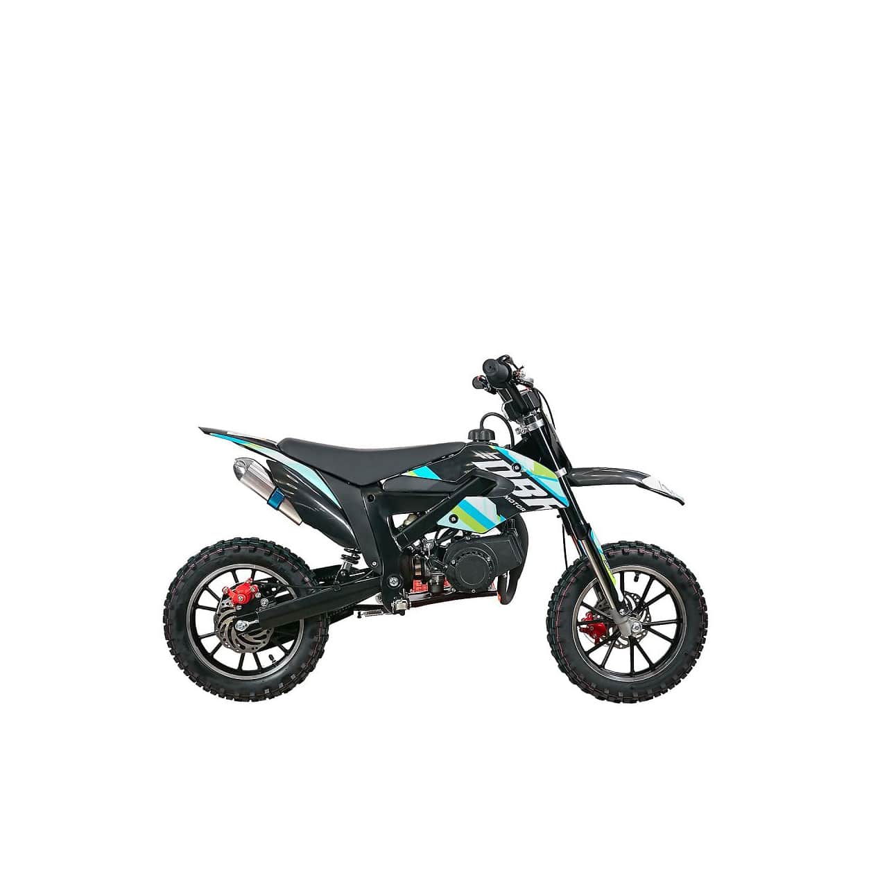 Питбайк оснащён одноцилиндровым 2-тактным двигателем воздушного охлаждения объёмом 50 см³, развивающим мощность 2,1 л.с. Карбюратор PZ обеспечивает стабильную работу в различных эксплуатационных условиях и лёгкость в обслуживании. Мотоцикл имеет автоматическую коробку передач, что позволяет сосредоточиться на управлении и не беспокоиться о переключении скоростей. Также для удобства использования предусмотрен ручной запуск двигателя.