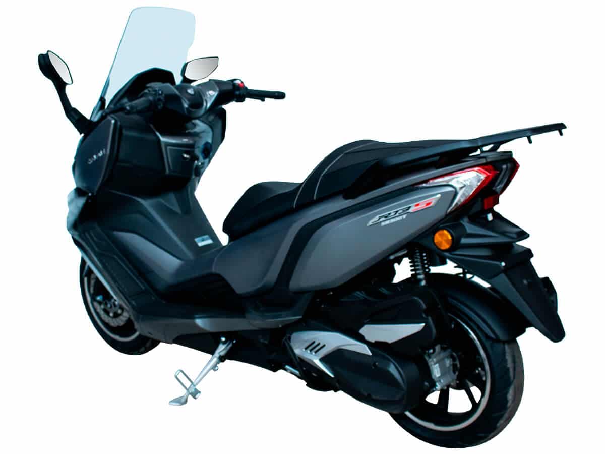 Скутер выделяется премиальной комплектацией: электрорегулируемое ветровое стекло, бесключевой доступ, встроенные камеры видеорегистратора и датчики давления в шинах. Литые диски 14/15 дюймов с бескамерными покрышками TIMSUN и подвеска с газонаполненными амортизаторами обеспечивают комфорт даже на неровных дорогах. При клиренсе 155 мм и весе 202 кг он сохраняет устойчивость на высоких скоростях, достигая 150 км/ч.