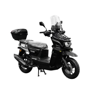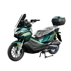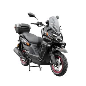 Скутер выделяется премиальной комплектацией: электрорегулируемое ветровое стекло, бесключевой доступ, встроенные камеры видеорегистратора и датчики давления в шинах. Литые диски 14/15 дюймов с бескамерными покрышками TIMSUN и подвеска с газонаполненными амортизаторами обеспечивают комфорт даже на неровных дорогах. При клиренсе 155 мм и весе 202 кг он сохраняет устойчивость на высоких скоростях, достигая 150 км/ч.