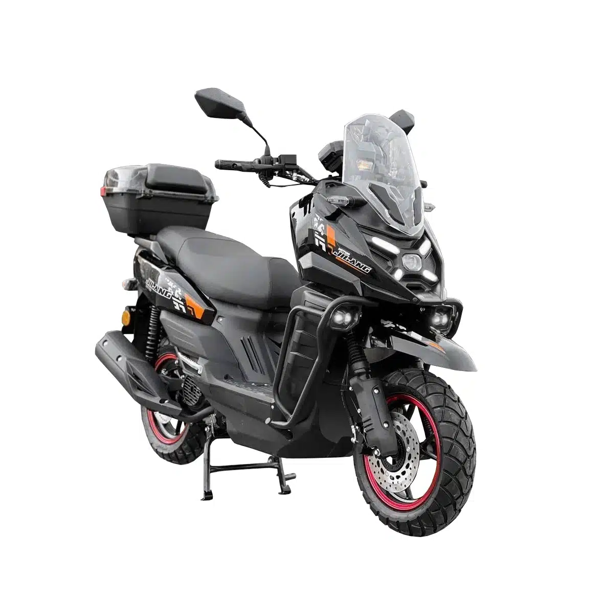 Скутер GT TANK 04 – это сбалансированная модель, сочетающая мощность и надежность для комфортных городских и загородных поездок. Оснащенный четырехтактным одноцилиндровым двигателем объемом 150 см³ мощностью 12 л.с., он развивает скорость до 75 км/ч, обеспечивая оптимальный баланс между динамикой и топливной экономичностью. Карбюраторная система подачи топлива и механическая КПП гарантируют стабильную работу двигателя, а гидравлические дисковые тормоза обеспечивают безопасное и уверенное торможение в любых условиях. Это идеальный выбор для тех, кто ценит надежность и практичность в повседневной эксплуатации.